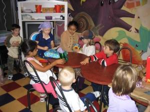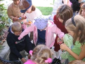 Taking a break during the tea party & collecting all the balloons after the tea party.